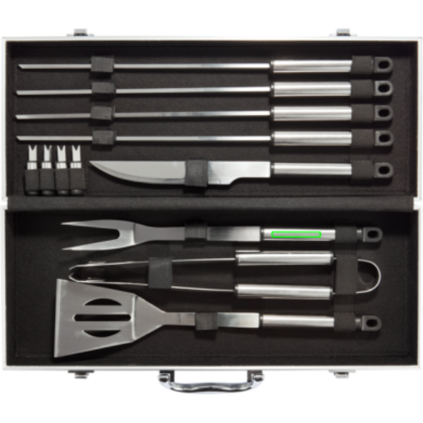 12-delige roestvrijstalen set in aluminium koffer inclusief spatel, tang, vork, vleesmes, 4 spiesen en 4 maïskolfhouders.