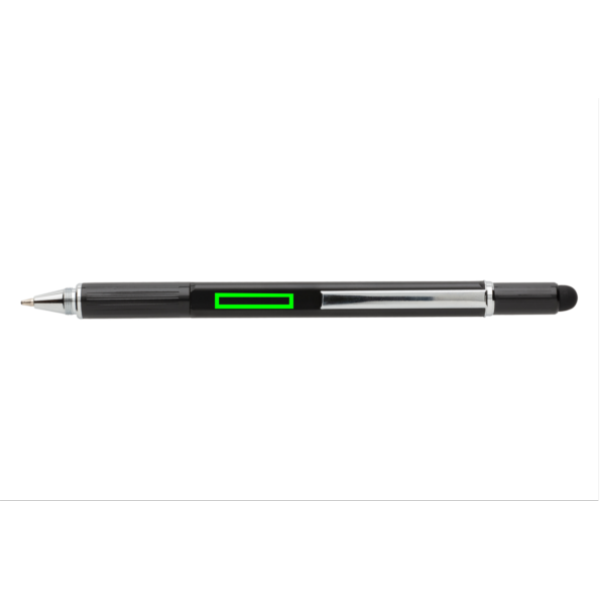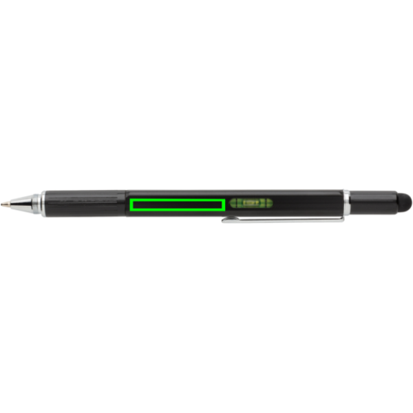 Multifunctionele touchscreen pen (blauw schrijvend) met lineaal (7 cm), waterpas en schroevendraaier. Gemaakt van hoogwaardig aluminium en aluminium clip.