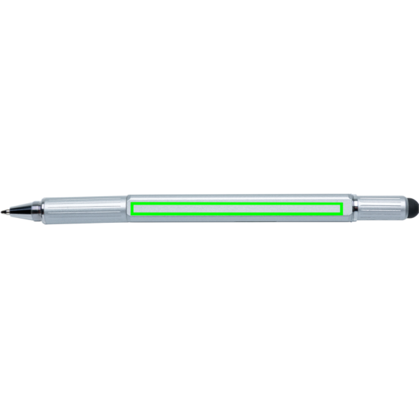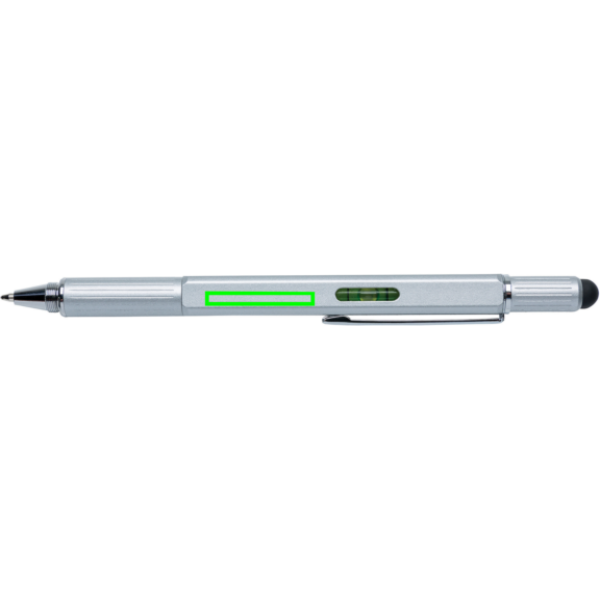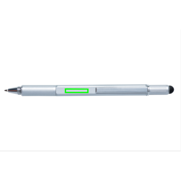 Multifunctionele touchscreen pen (blauw schrijvend) met lineaal (7 cm), waterpas en schroevendraaier. Gemaakt van hoogwaardig aluminium en aluminium clip.