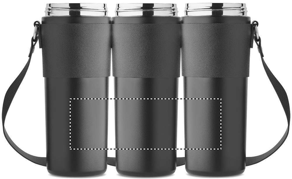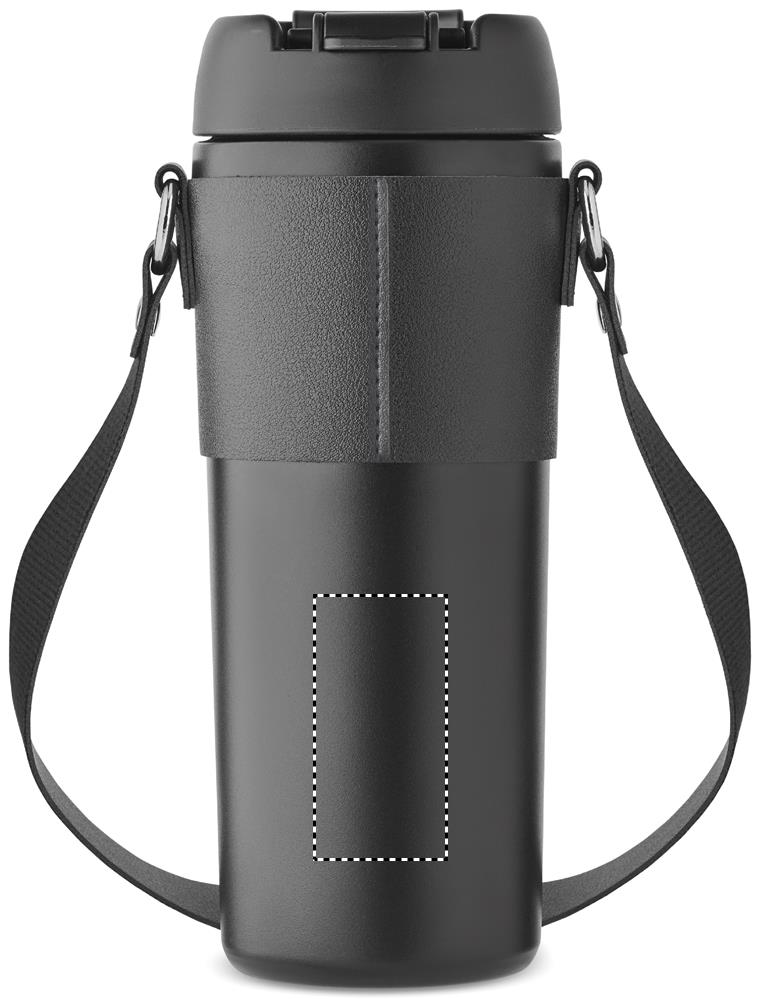 Dubbelwandige roestvrijstalen beker met poedercoating en PP dop (2-in-1 dop en rietje) en met PU draagriem. Lekvrij. Inhoud: 700 ml.