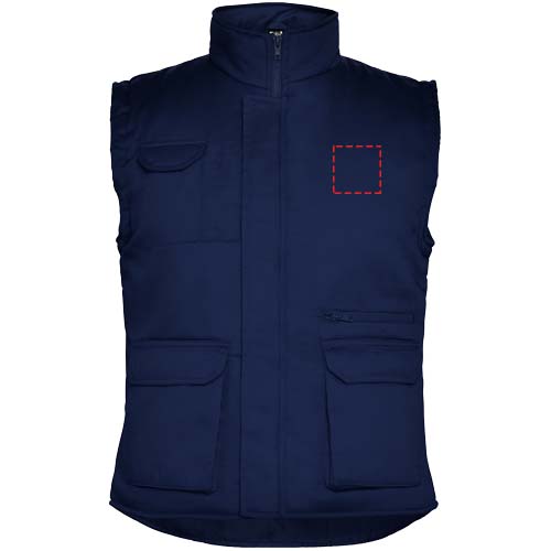 Veelzijdige werkbodywarmer met hoge kraag. Rits aan de voorkant met bandje en klittenbandsluiting. Eén buitenvak voor je telefoon aan de rechterkant. Twee zakken met inzetstukken aan de voorkant en zijsplitten. Twee kleine vakjes voor pennen. Eén binnenzak met klittenbandsluiting. Zakje met rits. Drop tail. Versteller met klittenband.