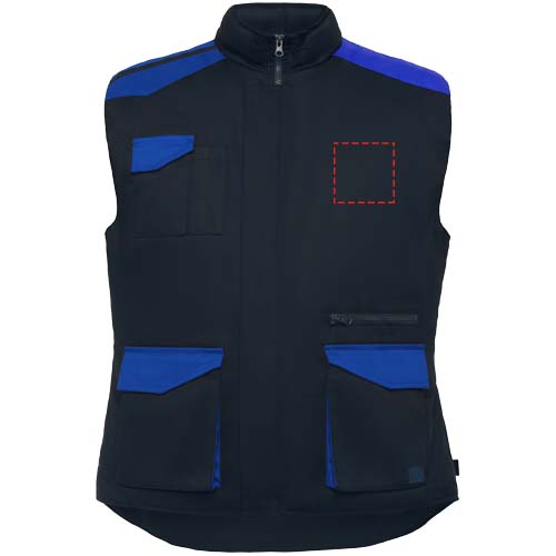 Werkvest met meerdere zakken in een tweekleurige combinatie, met hoge kraag. Rits aan de voorkant met klittenbandsluiting. Windbreakers in manchetten. Buitenvak voor je telefoon aan de rechterkant, met flap en klittenbandsluiting. Twee geplooide voorzakken met flap en klittenbandsluiting. Twee pennenvakken. Binnenzak met klittenbandsluiting. Zak met rits. Drop tail. Automatische aanpassing. Contrasterende schouderstukken en details.