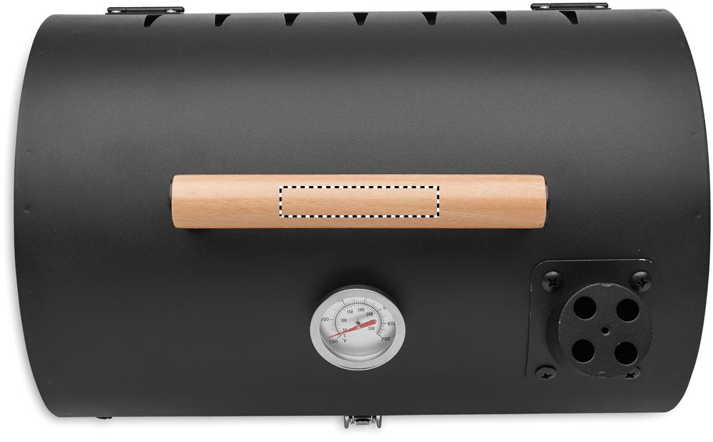 Draagbare barbecue van ijzer met schoorsteen en thermometer. Gepoedercoate vuurkorf. Vergrendelbaar en geleverd met een houten handvat.