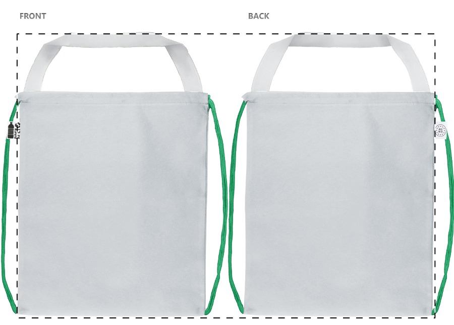 Custom made tas met trekkoordsluiting met gekleurde touwtjes en lange hengsels, 190T RPET polyester. Ook te gebruiken als boodschappentas. Met all-over sublimatiebedukking en onderscheidend RPET-label. MOQ: 25 stuks.