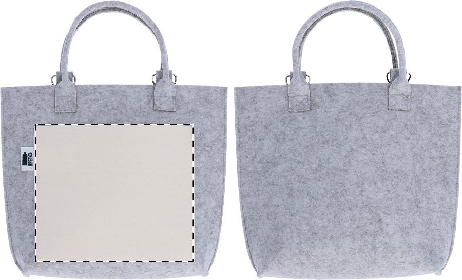 Custom made RPET vilten dames crossbody tas met full colour bedrukt voorvak. Met korte hengsels, afneembare schouderriem en kenmerkend RPET-label. Prijs is inclusief sublimatiebedrukking. MOQ: 25 stuks.