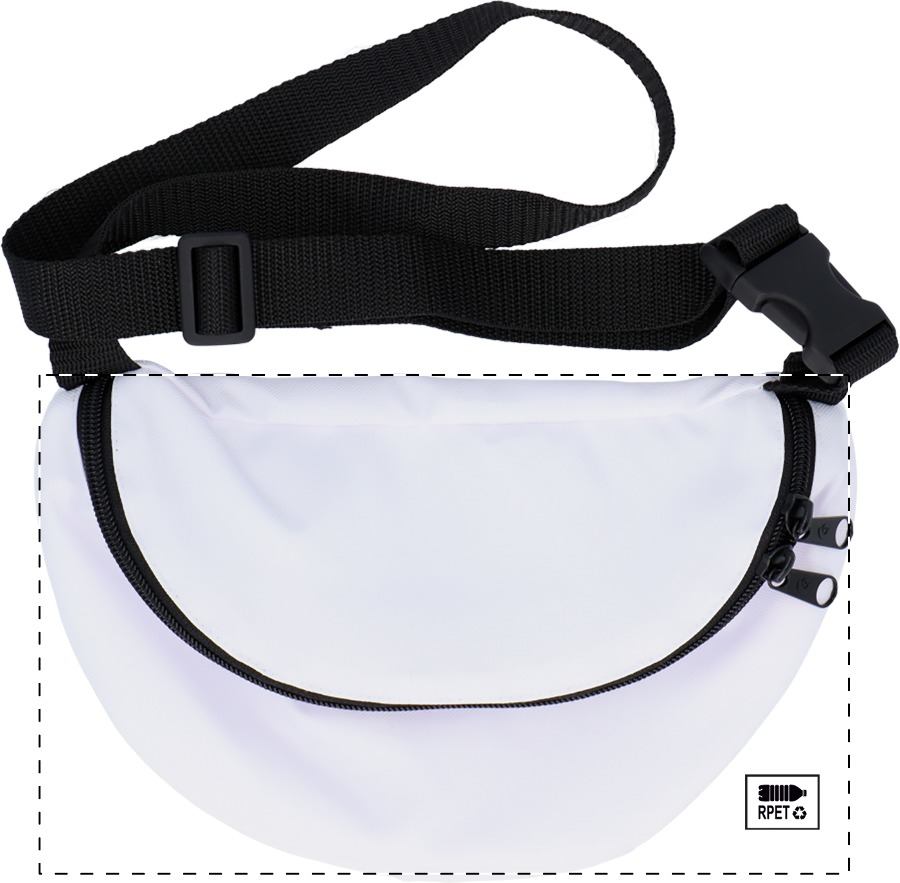 Custom made heuptas met ritsvak, 600D RPET polyester. Met all-over sublimatiebedrukking en RPET label. MOQ: 25 stuks.