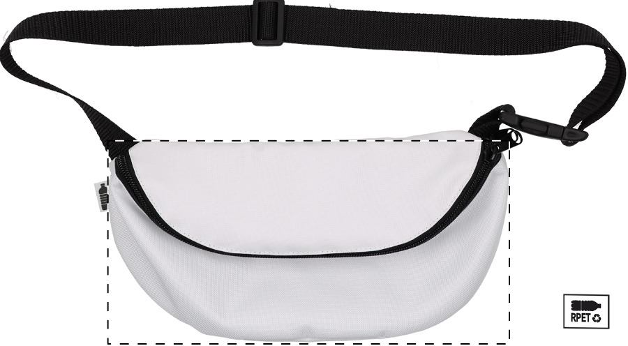 Custom made heuptas met ritsvak en RFID-beschermd vak, 600D RPET polyester. Met all-over sublimatiedruk en onderscheidend RPET-label. MOQ: 25 stuks.