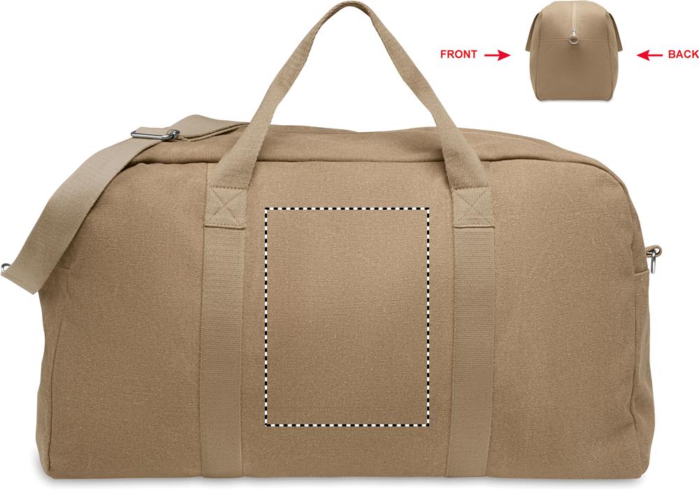 Reis-/ sporttas van gerecyclede 450gr/m² stoffen (60% gerecycled katoen en 40% gerecycled polyester) met verstelbare en afneembare katoenen schouderriem.