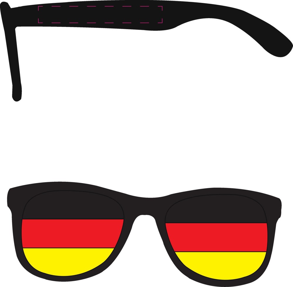 Feestbril met zwart PC-frame en afneembare ketting van zwart/rood/gele polyesterbloemen, die met kleine karabijnhaken aan de poten is bevestigd. Licht en comfortabel om te dragen. De glazen zijn bedekt met een geperforeerde folie in vlagkleuren. Geen UV-bescherming.
