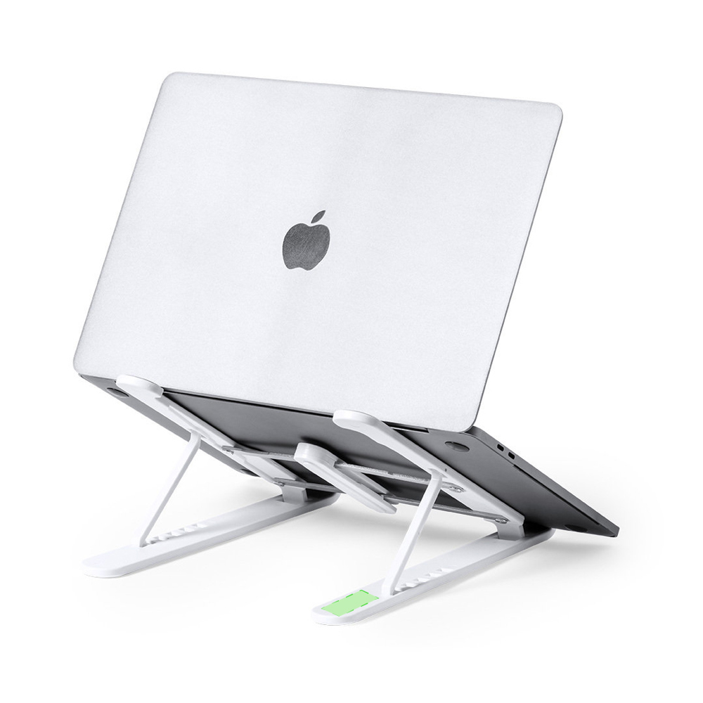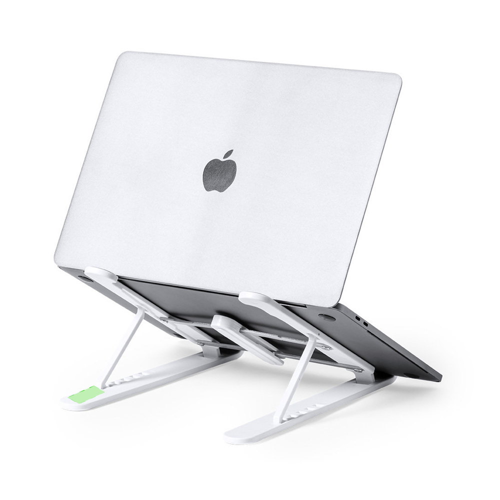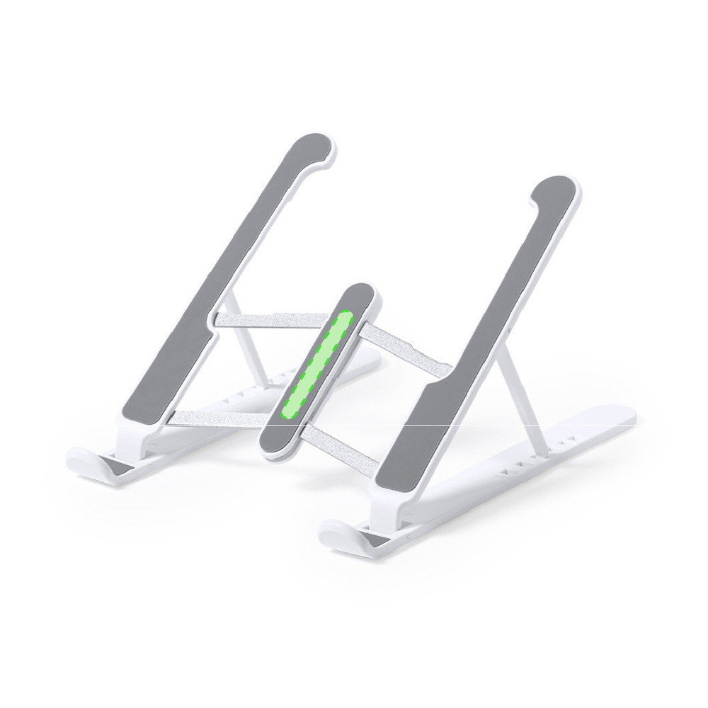 Opvouwbare laptop standaard. Gemaakt van duurzaam ABS met anti-slip TPR beschermingen voor een stevige pasvorm aan het apparaat.In hoogte verstelbaar, compact opvouwbaar en gepresenteerd in een suède hoes met trekkoord sluiting en in een individuele ontwerpdoos.
