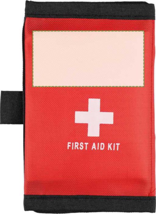EHBO-tasje van rPET 600D polyester met klittenbandsluiting en draaglus. Voorzien van PVC-vakken en gevuld met 17 onderdelen: 5 pleisters, 1 steriel filmdoekje, 1 non-woven spons, 8 alcoholdoekjes en 2 reinigingsdoekjes. Afgewerkt met een rPET-label aan de buitenkant.